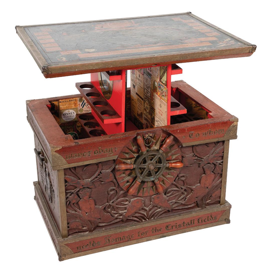 Sarcophagus form in flame mahogany and mahogany veneer with brass line inlay. Hinged lid with brass ball knob. Fruitwood interior knife partition with contrasting inlay along perimeter. Brass grape cluster medallions applied to each of the four corners of the plinth base. Brass paw feet fitted with casters. Includes a 50-piece cutlery set with green wood handles and silver bolsters. Height 16”. Width 14.5”. Depth 10.75”. 5,000/7,000