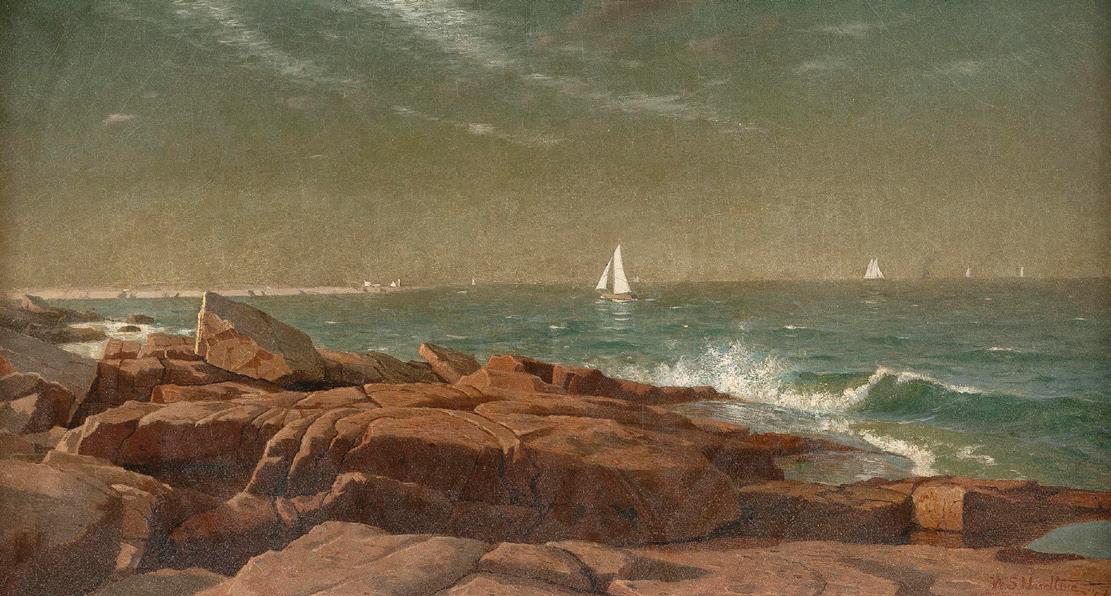 Massachusetts, 1958“The Deep Blue Sea” (Naushon Island). Signed lower right “Joseph McGurl”. Titled on label verso for Tree’s Place Gallery, Orleans, Massachusetts. Oil on canvas, 24” x 48”. Framed 36” x 60”. 25,000/35,000