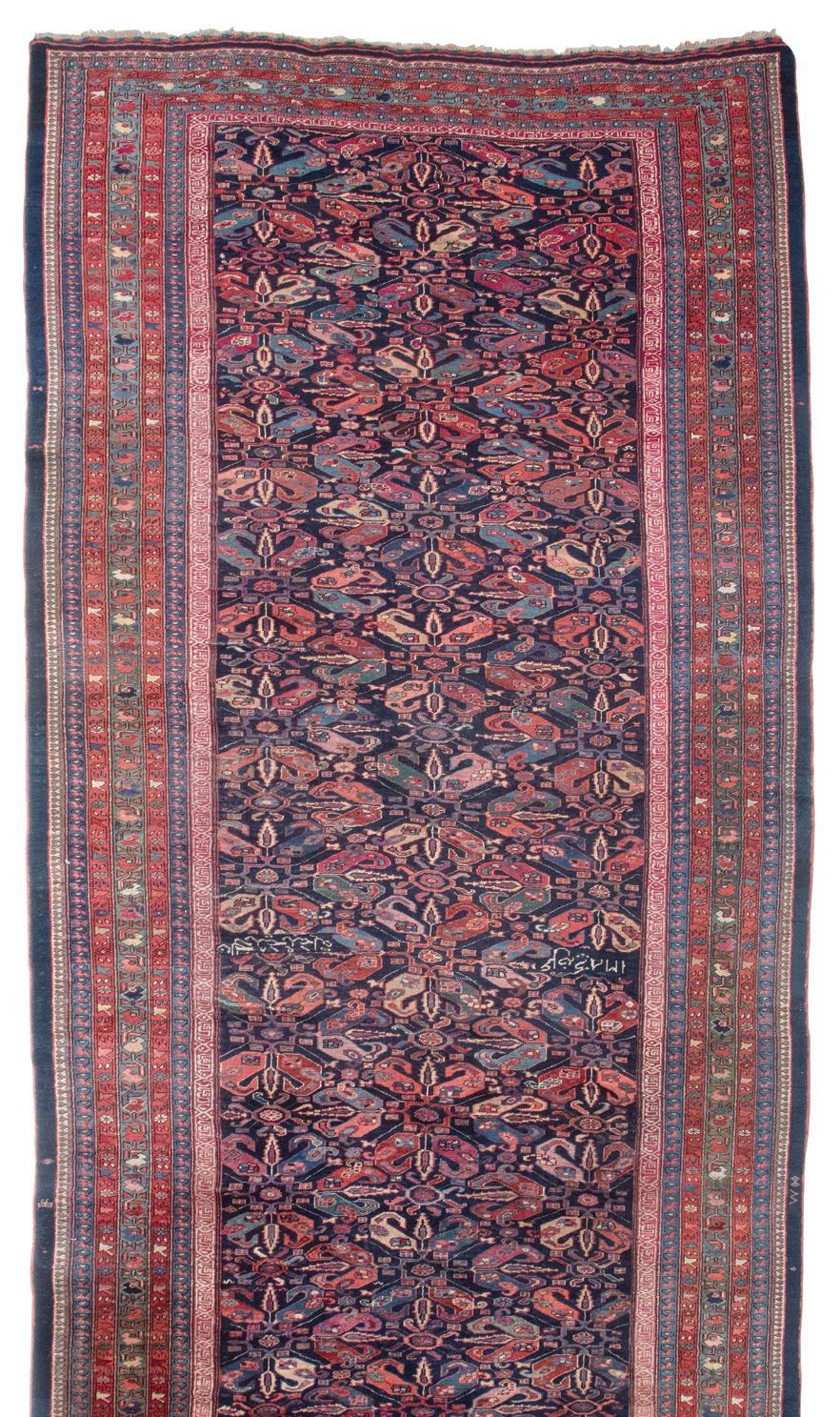 First Quarter of the 20th Century Navy blue field with three columns of red, blue, green, pink, gold and lilac boteh arranged in cruciforms. Two phrases in Arabic script near the center line of the field. Multiple narrow borders contain a variety of motifs. 1,000/2,000
