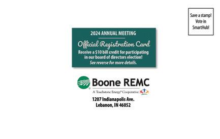 In late March, all Boone REMC members were mailed an official notice of our 2024 board of directors election and Annual Meeting. You can earn a $10 bill credit for your participation.