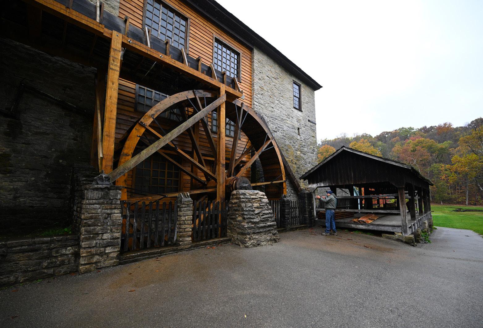 At Pioneer Village, costumed interpreters re-enact 19th century life in about 20 historic buildings (most reconstructions and relocated originals), mimicking the Spring Mill community that once thrived here. The star attraction, a 200-year-old restored grist mill, resumed grinding corn a year ago after breaking down in 2021. It was rebuilt using tornado-toppled timber from McCormick’s Creek State Park.