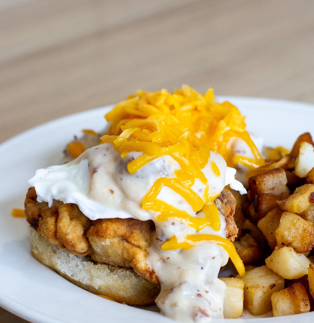 In addition to gluten-free and children’s options among its traditional breakfast and brunch fare, Rosie’s Place offers brown sugar oatmeal pancakes, a daily quiche, breakfast tacos, burritos and quesadillas, a pork tenderloin benny, and “Eggs Blackstone,” described as “cornbread, split and grilled, topped with roasted