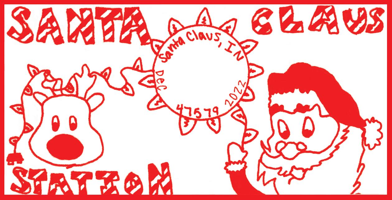 This special picture postmark is different each year, chosen from entries submitted by art students at nearby Heritage Hills High School. The top design becomes the featured picture postmark to cancel postage stamps on holiday mail out of the Santa Claus, Indiana, Post Office. The design is revealed in early November.