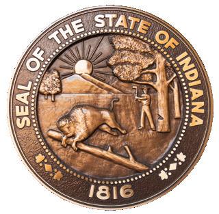 The Indiana seal design consists of a woodsman chopping a tree with his ax and a buffalo jumping over a log, with sycamore trees, hills in the background and a sun with 14 rays.