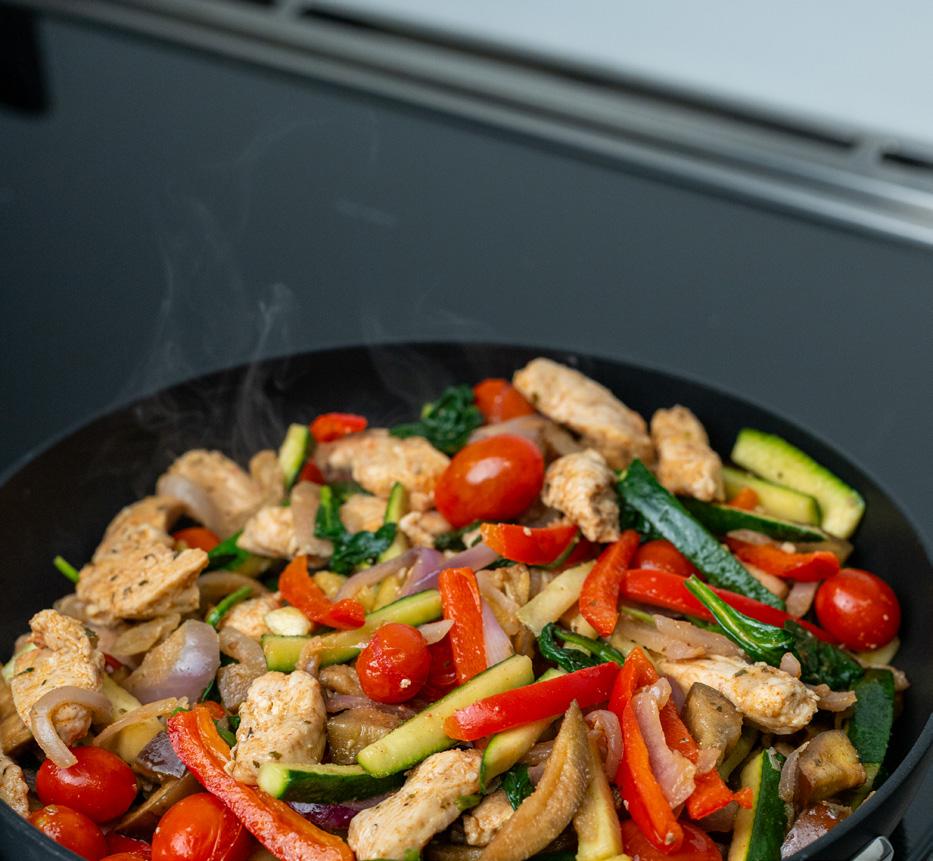 sure not to oversalt. Taste as you go, then set the vegetables aside next to the chicken. Add the last of the olive oil and toss in the cherry tomatoes, cooking until they blister and sizzle a little. Add the spinach and mix gently until wilted. Add the stir-fried vegetables and chicken back to the pan, mixing gently for a few moments to combine all the flavors. Serve immediately on its own or over rice or cooked grains. (Serves four.)
