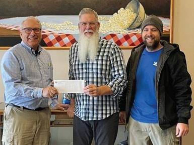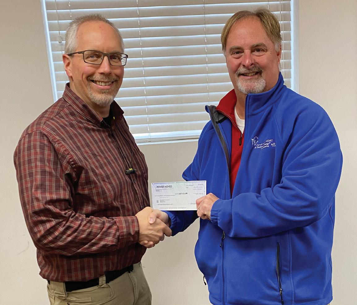 Spear, left, presents Galen Hoover of the I-65 Chrome Shop with a rebate check for $10,000 for work done at the shop.
