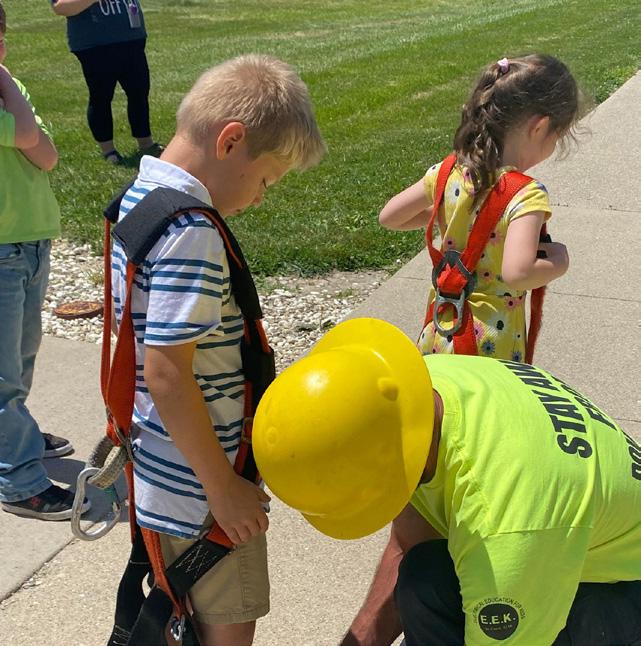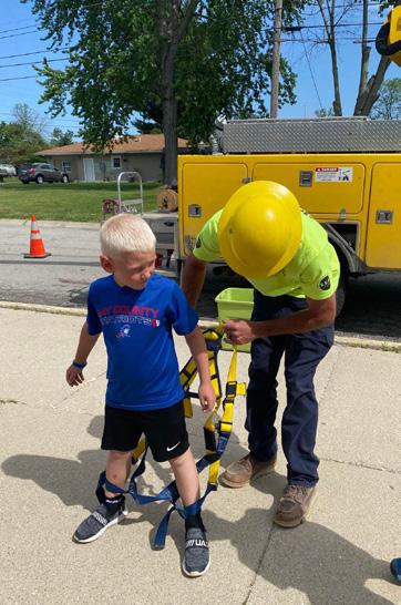 Lineman Dan Paxson helps first-grader Lake Willmann into a safety harness before he takes a ride in the bucket truck. On this beautiful May day, Lake’s class, along with several other first-grade classes, learned about electric safety and enjoyed bucket truck rides.