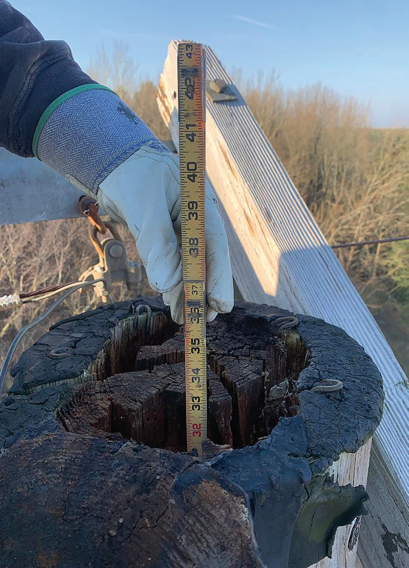 A Hoosier Energy crew member measures the depth of the hole created by woodpeckers in a wooden pole along the right of way in Redbird State Recreation Area.