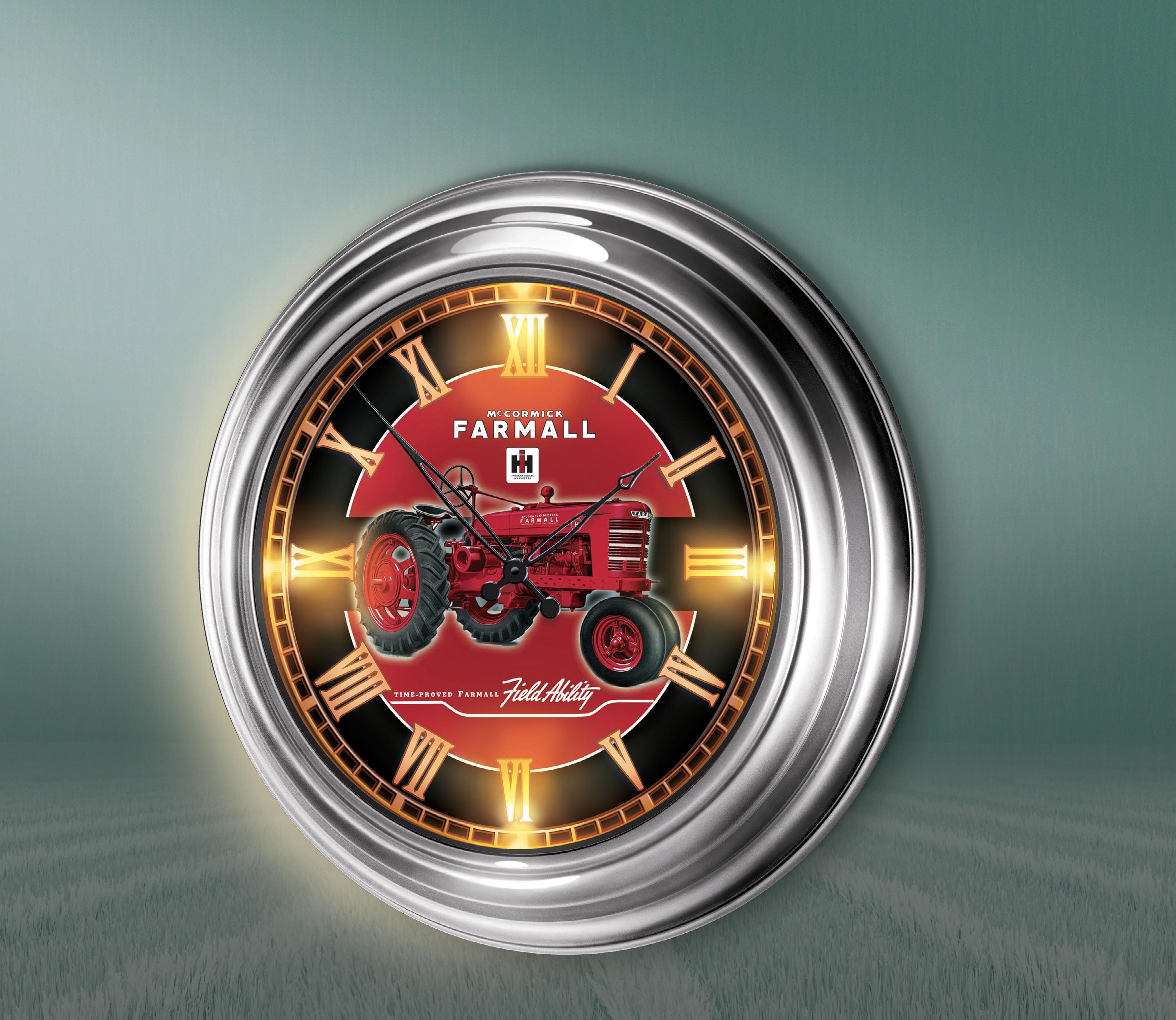 The classic Model H tractor stands proud against a black-bordered, Farmall red background, along with the IH logo and “time-proved” slogan. Because it is in sync via radio waves with the of cial source of U.S. time in Fort Collins, Colorado, it is completely self-setting* and accurate to the second. You never need to adjust it, even for Daylight Savings. As night falls, a built-in sensor cues hidden LED lights to