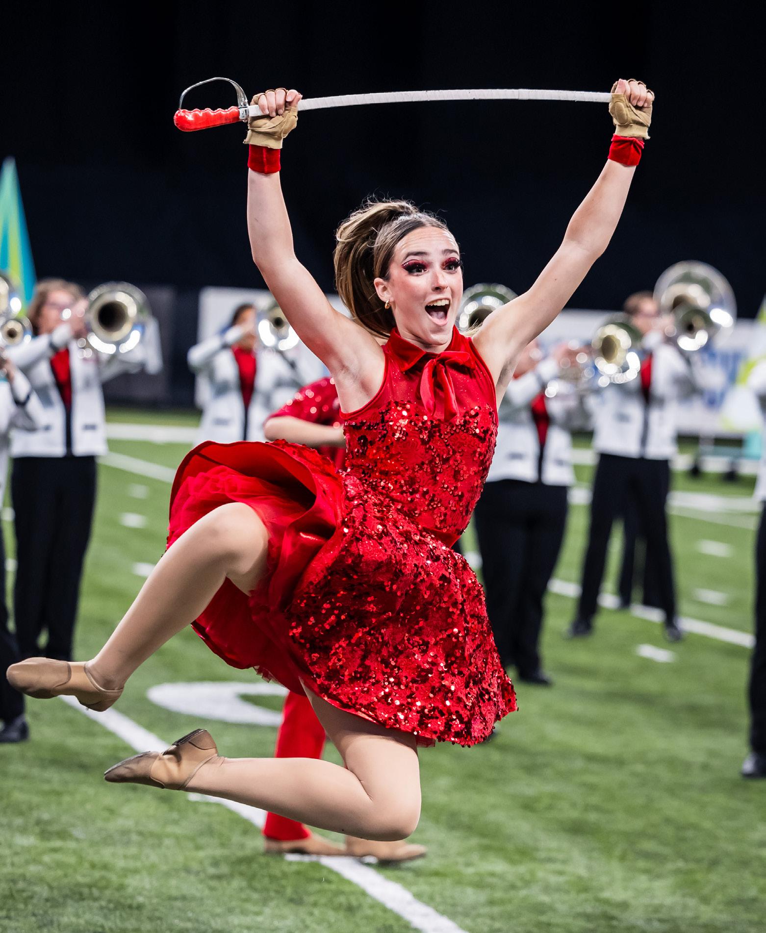 A member of Carmel High School’s Marching Greyhounds performs at the 2023 Bands of America Grand National Championships at Lucas Oil Stadium in Indianapolis. Carmel came in second place, with Avon High School, also from Indiana, taking first.