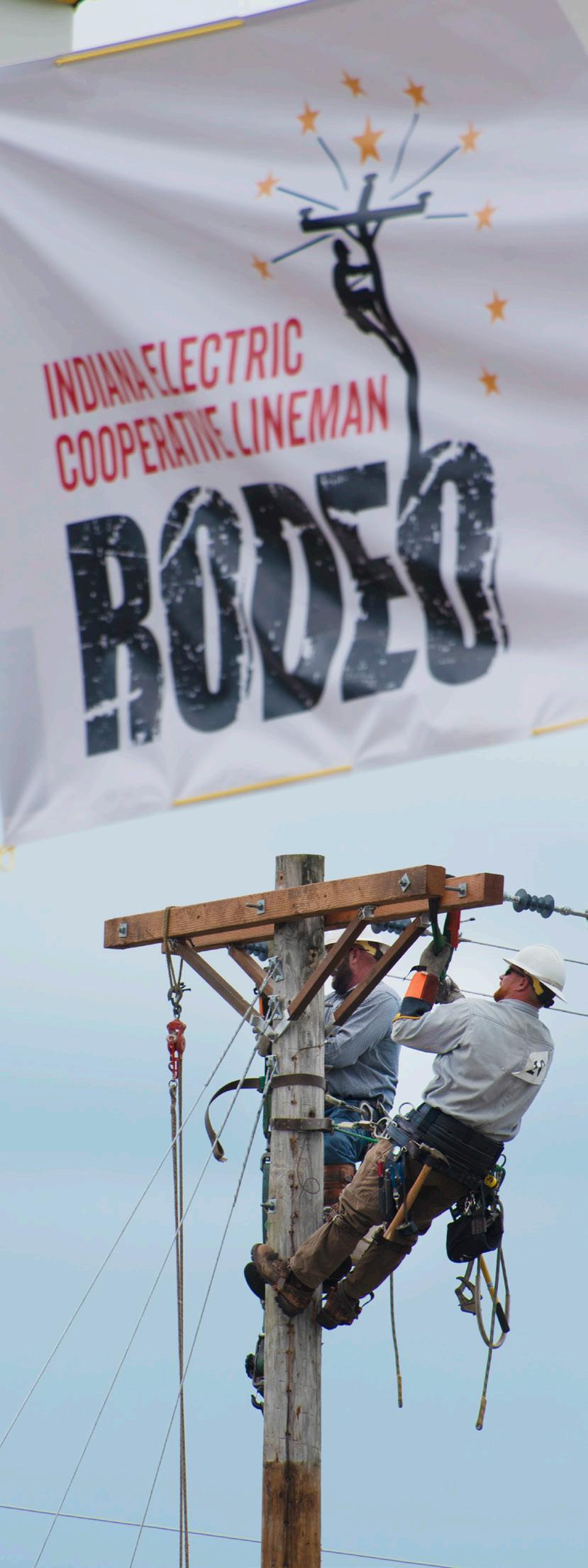 Right: A welcoming banner greeted participants, their families and observers to the first Indiana Electric Cooperative Lineman Rodeo in August. Hendricks Power Cooperative linemen Taylor Long, right, and Dan Love, change out equipment in one of the team events.