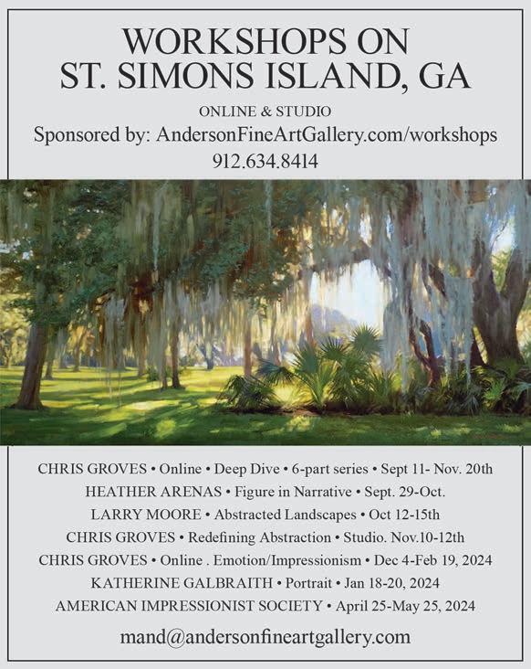 For the past 14 years, ARTISTS ANNEX GALLERY, sponsored by the Anderson Fine Art Gallery, has o ered workshops taught by professional artists from across the country. Workshops range from plein air, to abstract to still life and are o ered to students of all levels. Private lessons are available. andersonfineartgallery.com/artists-annex-gallery