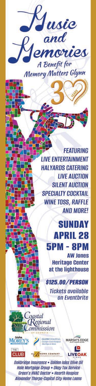 For a full list of times and dates for counseling sessions, Caregiver Connections meetings at all locations, a calendar showing all of the free events offered by Memory Matters each month, and more detailed information about their services, visit their website at memorymattersglynn.com. While you’re there, hit the Music and Memories tab and purchase your tickets to attend the April 28 event! Tickets are $125 and your support is greatly appreciated. Sponsorship opportunities are still available as well. If you’d like to become a sponsor or donate to the auction, call 912.264.0777.