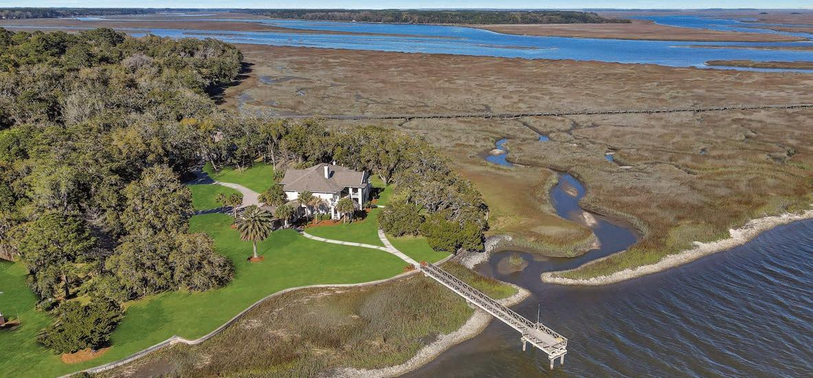 “Luxury Coastal Living” is a classic Lowcountry home with wrap-around drive, expansive lawn, and coastal plantings. A noteworthy feature here is the unique sculpture under the front entry that the Bland Farm family sweet onion business. The back yard offers a screened porch, grilling sunny pool, putting green, and fire pit. Quaintly tucked away beyond a tree with a bed of ginger lilies, camellias, hydrangeas, and cast-iron plants is a delightful, pink “dollhouse.” Live oaks, palmetto palms, and muhly toward the bridge and dock on Dunbar Creek.