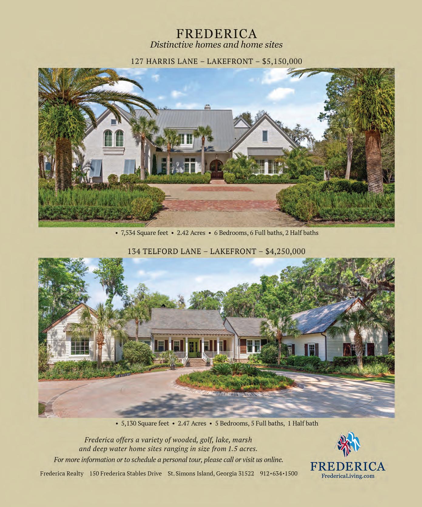 118 PIRATES COVE Saint Simons Island, 4BR | 4BA | 4,380 SF | $1,249,000 This house features 3,400 square feet of main living space on the bottom floor of the house, featuring four bedrooms and four bathrooms. The upstairs is 1,000 sf of heated and cooled bonus living space that can be used as additional bedrooms, offie area, or climate controlled storage. A large sunroom spans the back of the house, complete with its own HVAC system. The yard has a 7-zone irrigation system on its own well, as well as yard lighting. This home is conveniently located in the mid-south part of the island, just 1 mile from the causeway and a short bike ride to the beach.