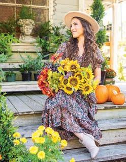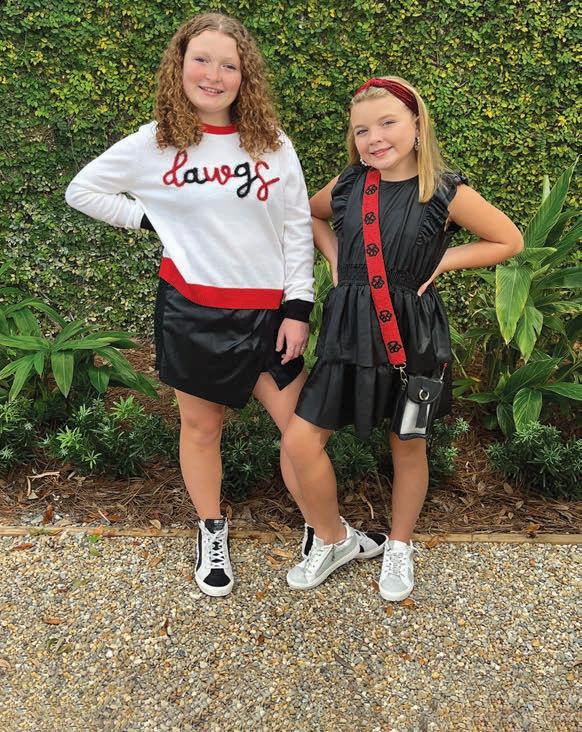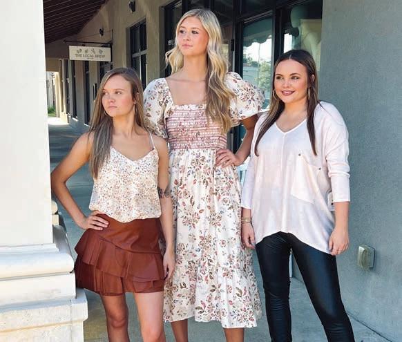Sunflowers and smiles from Sophia Holloway and Mia Collins would brighten any day. Sophia wears a floral dress by Buddy Love, hat by Mud Pie and hoop earrings, all from Yellow Canary. Mia’s olive Ryu top by Kerisma and ivory Ponte Bruna Cord pants by Lucy Paris and suede booties by MIA are from Butler’s Stash. Her oak leaf jewelry is available at Golden Isles Bracelet Co.