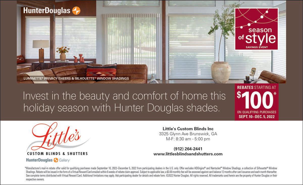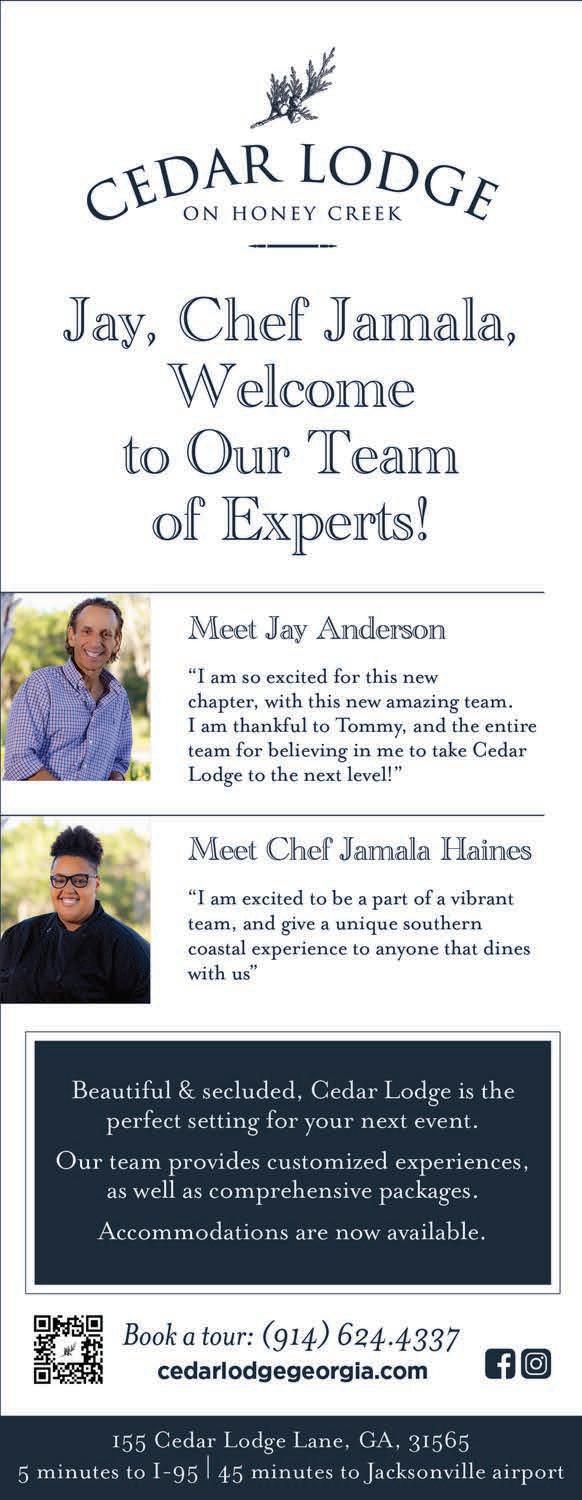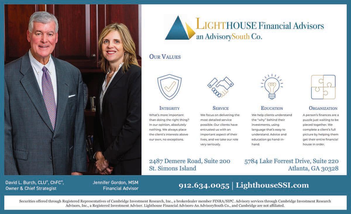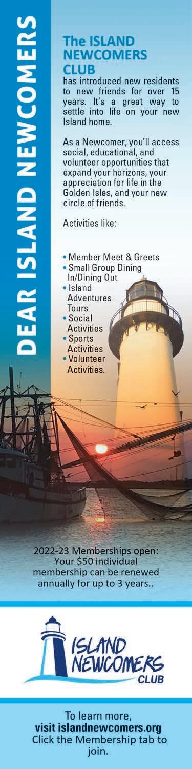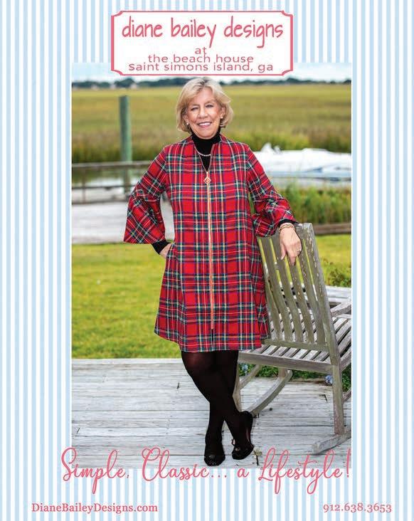 Elegant IslandLiving is published monthly. Reproduction of any photographs, artwork, or copy prepared by Elegant Island Living is strictly prohibited without prior written permission of the publisher. The advertisers and publisher are not responsible or liable for misinformation, misprints, or typographical errors. All electronic files submitted to Elegant Island Living become property of the magazine. ©2022 Elegant Island Living P.O. Box 21763 St. Simons Island, GA 31522. All Rights Reserved.