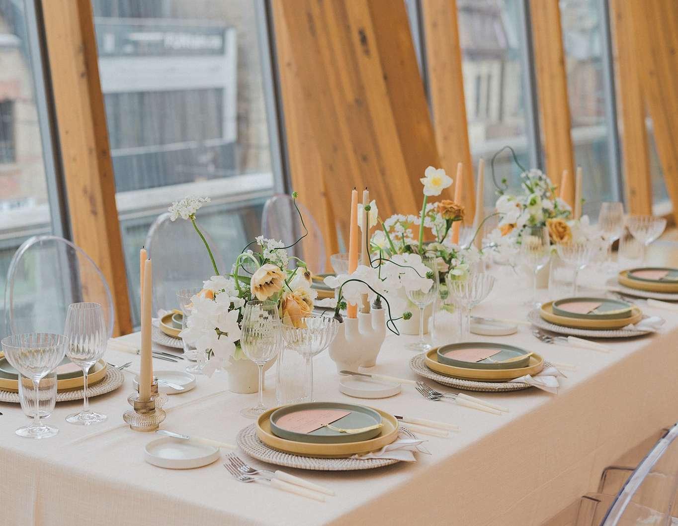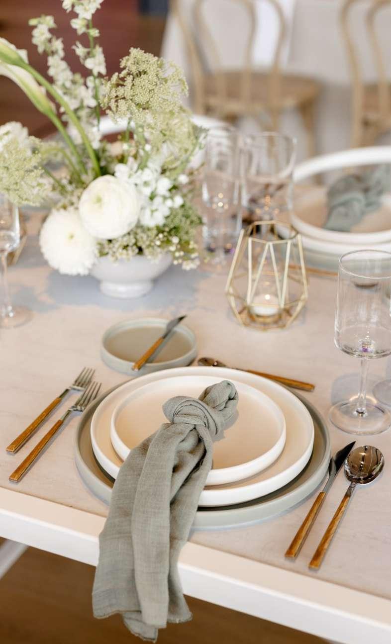 Artisan Garden captures the beauty of natural simplicity – layered herbal greens, organic textures, and tactile linens combine to form a table that feels grounded, elegant, and handcrafed.