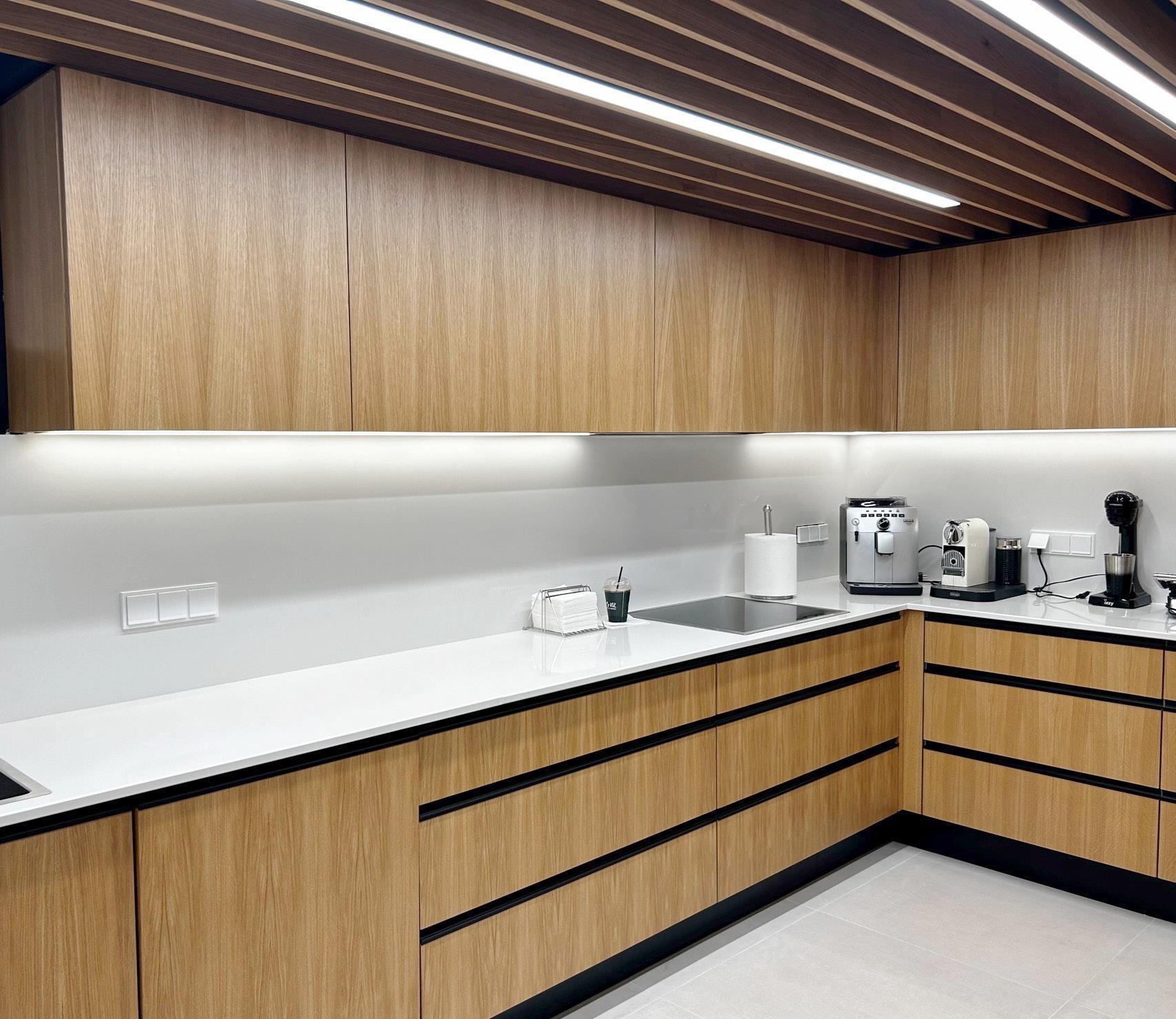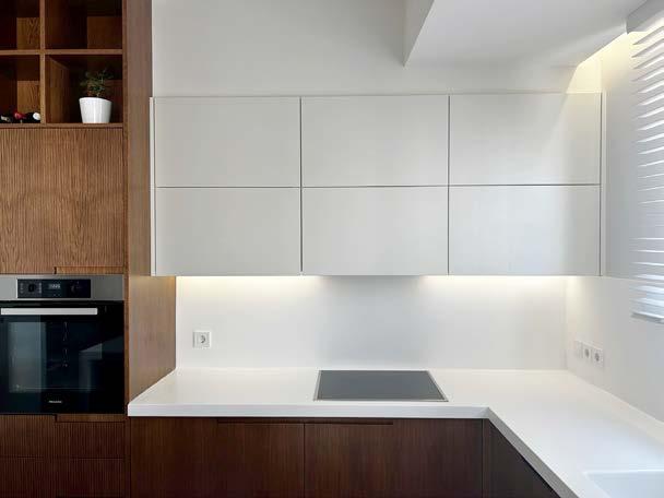 Materials: Oak wood, marble, fluted glass and quartz surfaces