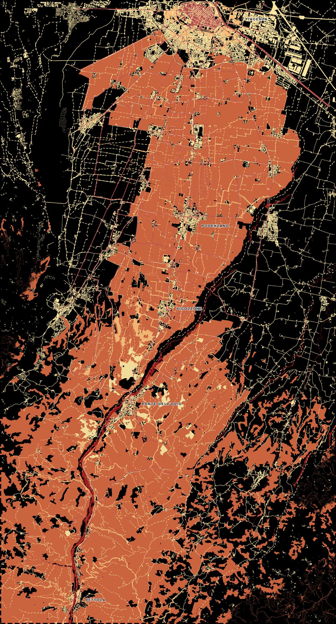 The synchronic map is the result of all the informations collected from the older maps, and confronting them to the actual landscape. Comparing the recent situation the difference are striking in terms of urban centers, Piacenza has further expanded outside the walls, and cities like Podenzano, Vigolzone and Ponte dell’Olio expanded as well with new residential neighborhoods around the historical centers. Bettola on the other side didn’t expand much, the result of the lack of real connection between alta Val Nure and the main center of Piacenza.