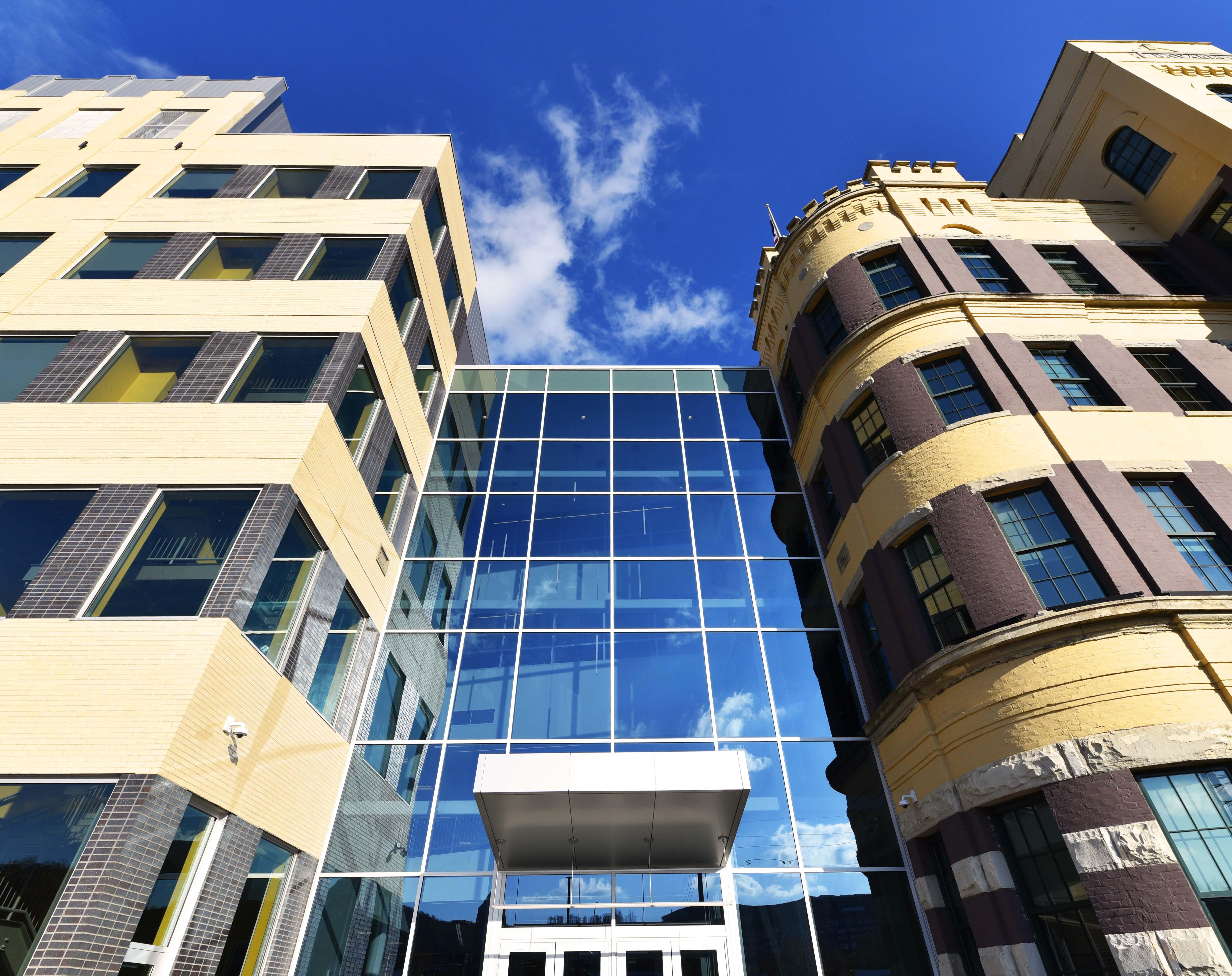 The existing space for the County was lacking adequate operational and parking space. After a long and complicated process, the County decided on the Bavarian Brewery site as their new home. This design/build project now houses all of the County government under one roof. The tower from the brewery remains and a new five-story office building is connected with a pedestrian bridge.