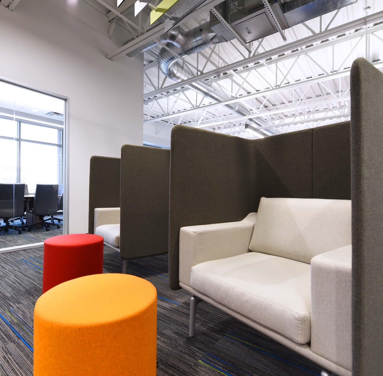 multi-generational recruitment. The new space was envisioned to encourage collaboration between teams wile creating the quiet work place needed by some employees. Development of a brand identity with a focus on history, industry and technology was paramount to a successful project.