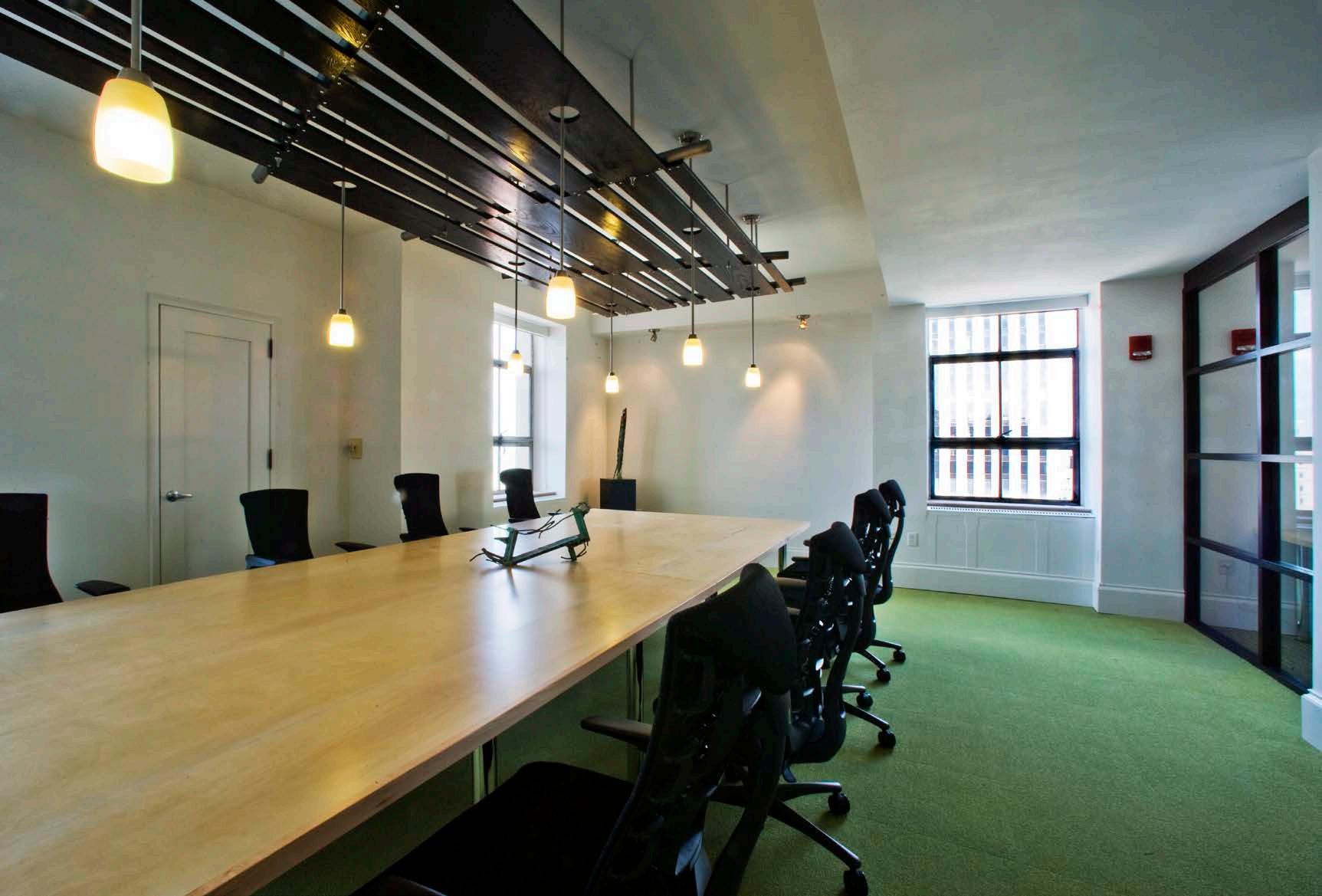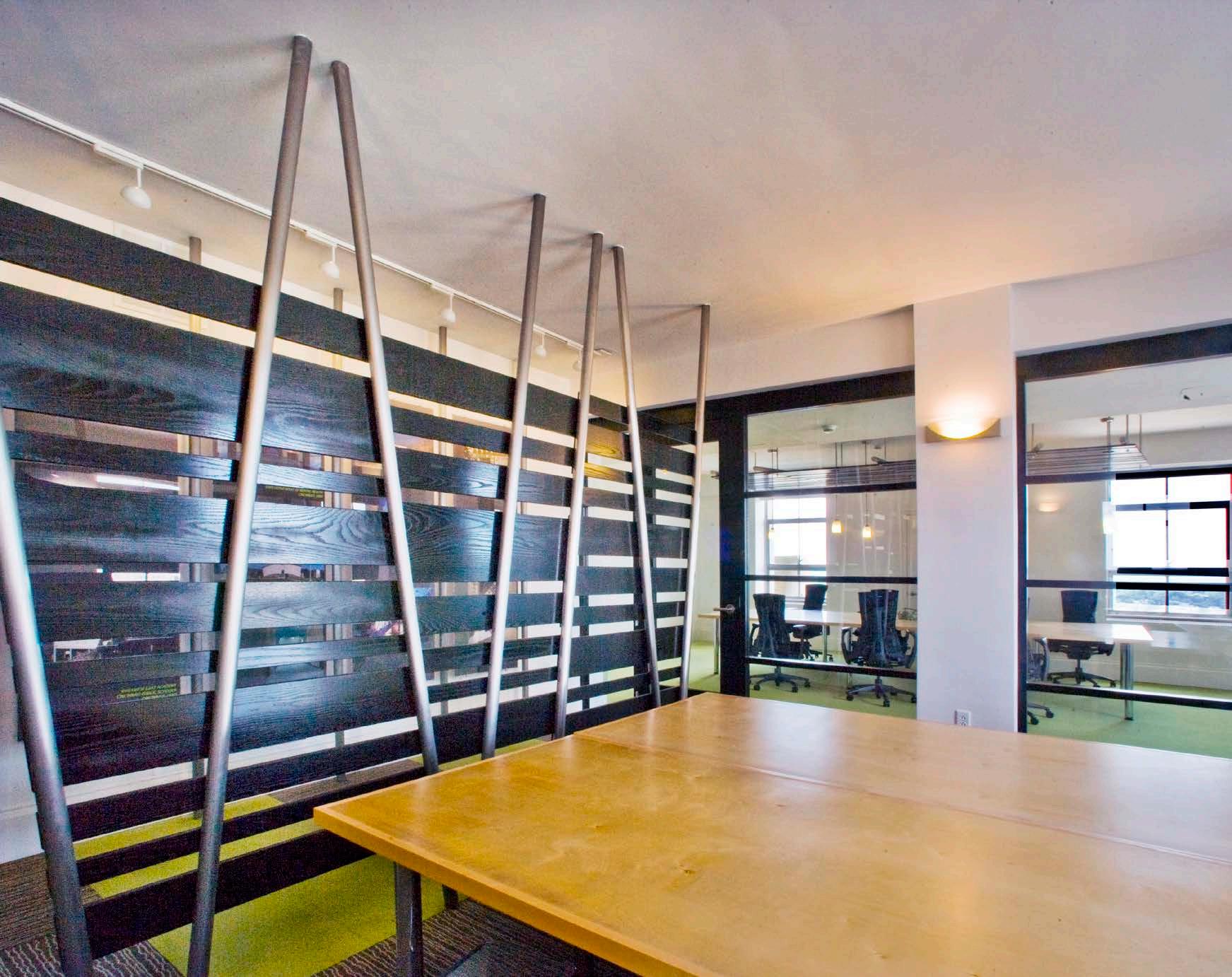 ceiling lines of this concrete frame skyscraper by utilizing understated wall sconces and directed task and accent lighting. The distinctive partitions demarcating the public space from the work stations constructed from buffed and polished automobile muffler piping and reclaimed wood slats are offset by the subtle palate of sustainable textile choices for the carpet and furnishings. A ceiling ‘cloud’ suspended above the conference room table references the same language as the work station partitions, and brings a more suitable scale to the space. This project is slated to receive LEED Silver Certification for Commercial Interiors and has recently won a Cincinnati Magazine Interior Design Award.