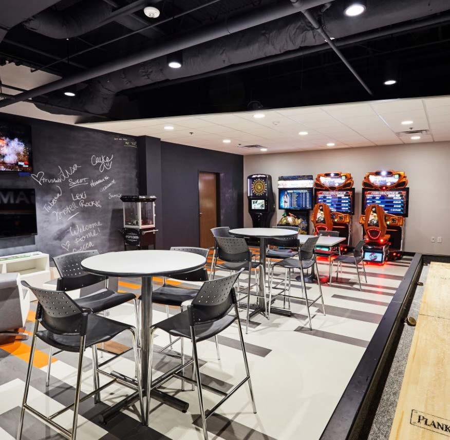 The energizing new office is equipped with open work space, a game room, a salon, state-of-the-art conference rooms, and a full kitchen and commons area. Scope of work for the project included reconfiguration of office spaces, new paint and environmental graphics including wayfinding and signage. Milwork, flooring, lighting concepts, and other finishes were carefully selected to complement the newly developed branding.