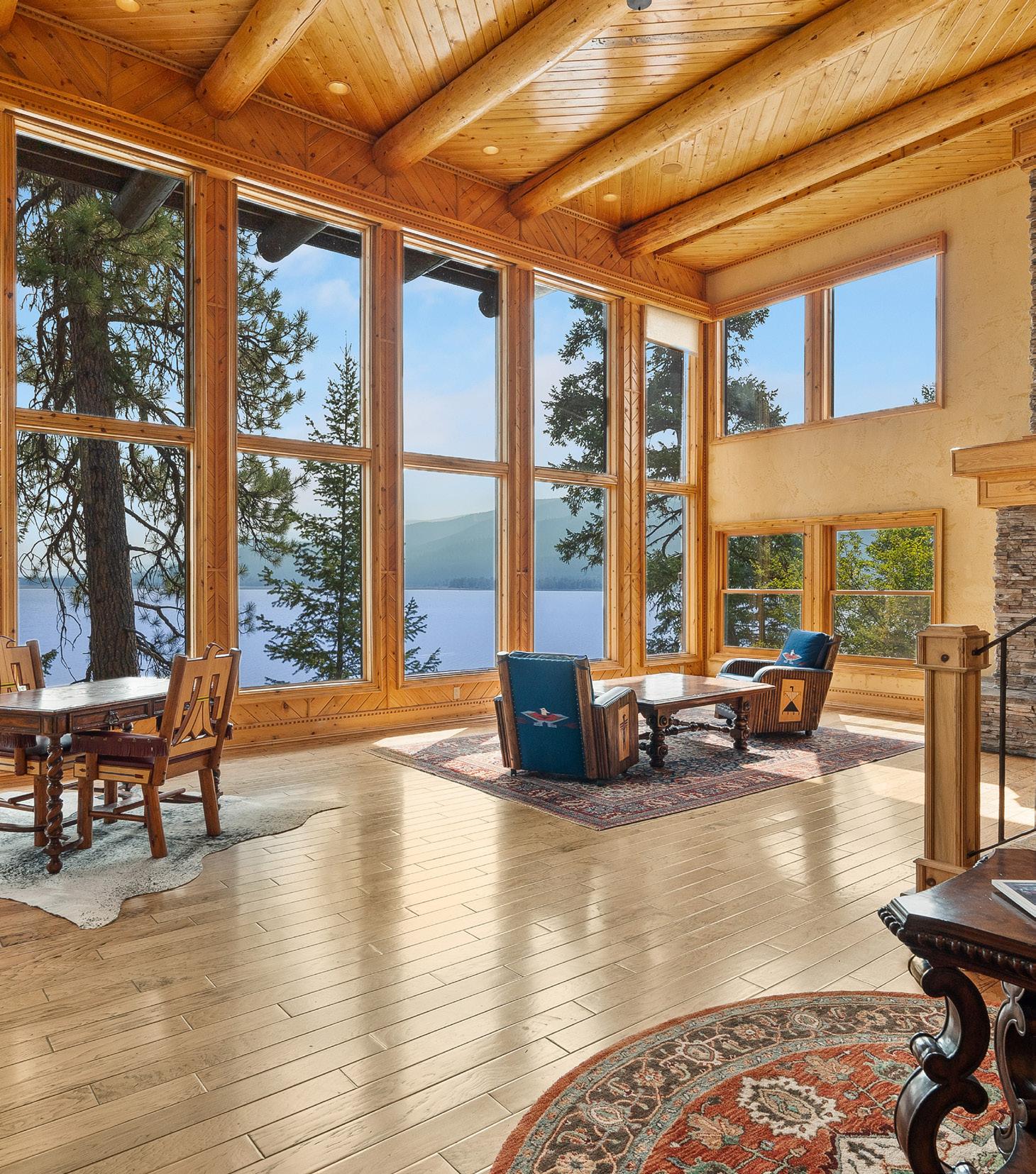 xperience the epitome of lakeside luxury at this stunning 4BD/7BA 7,574 SF custom cedar home on 0.65 acres w/ 210’ of pristine Swan Lake waterfront! 20 min from Bigfork & Flathead Lake, this secluded end-of-the-road property offers breathtaking views of the lake & mountains. The home features a private boat slip/dock, 7 decks, a wraparound patio w/ a fireplace, & more. The expansive main living wing includes a chef’s kitchen, a grand Great Room, a cozy library, a theater, & an upper-level primary suite w/ views that will leave you breathless. A sun-filled corridor leads to the guest wing, where you’ll find a game room & bar, 3 guest suites, & access to the outdoor entertainment spaces. A gated driveway ensures your privacy. Located in a prime spot for watersports & fishing, w/ the Flathead National Forest’s 4-season recreation just steps away, this property is a true sanctuary for nature lovers & outdoor enthusiasts alike. See supplemental remarks below for more information. Enter the carved glass double paned doors to a grand foyer that welcomes you into the heart of Western Montana living. Exposed log beams on the ceiling and Natural stone onyx travertine tile flooring from Turkey add a luxurious and cozy touch to the exquisite layout.