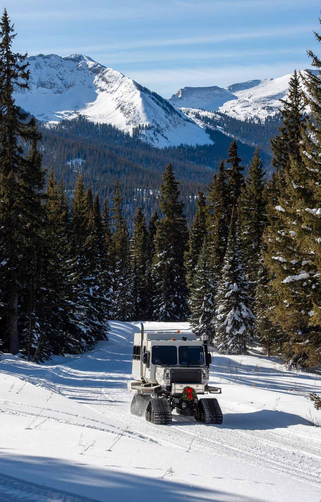 Set about 12 miles west of Crested Butte, Irwin is home to Eleven’s 1,000+ acres of exclusive cat-skiing terrain. Conditions permitting, the snowcat picks you up at the front door of the lodge and takes you on a 45-minute ride through beautiful mountain scenery to Irwin. Our snowcats are custom built with your comfort in mind—think leather seats, flat screen TVs, heat, sound systems, and large windows.