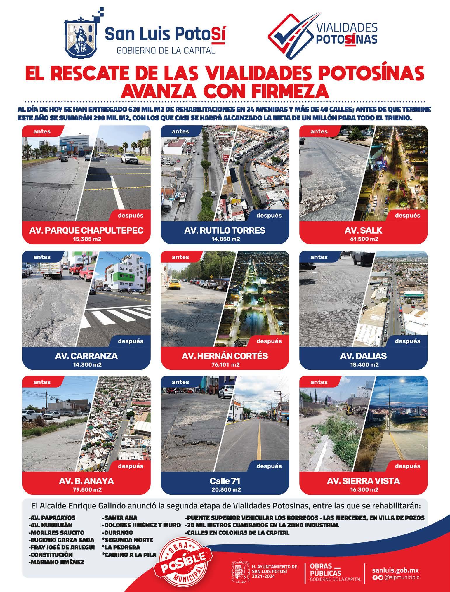 Además, la continuación de una nueva etapa de la vía alterna Circuito Vial Potosí al Eje Industrial 122, junto a la regeneración de la avenida CFE.
