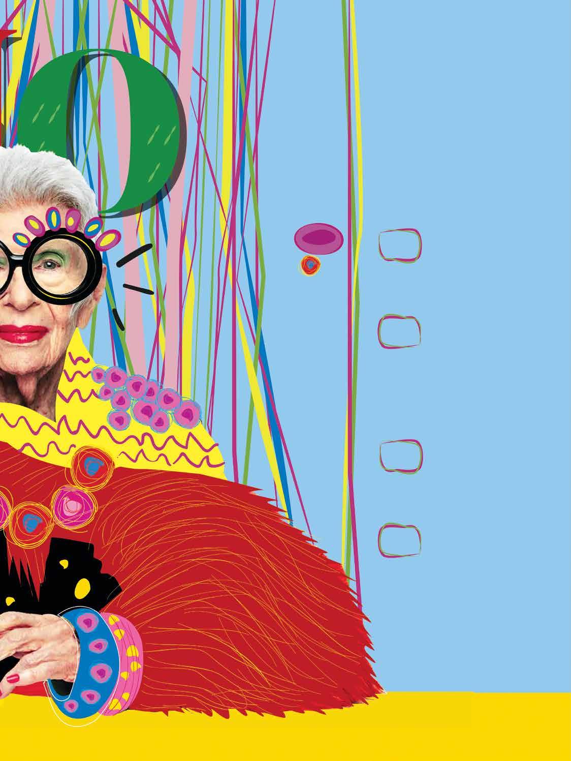 LA MODA COMO ARTE Apfel tenía un sentido de la estética único que llevó a cada parte de su vida, como sus looks y su casa, con su gran creatividad y experta curaduría. Su expertise en la creación y mezcla de textiles, estampados, texturas y patrones hizo que fuera un referente en el mundo del diseño de interiores y también de la moda.