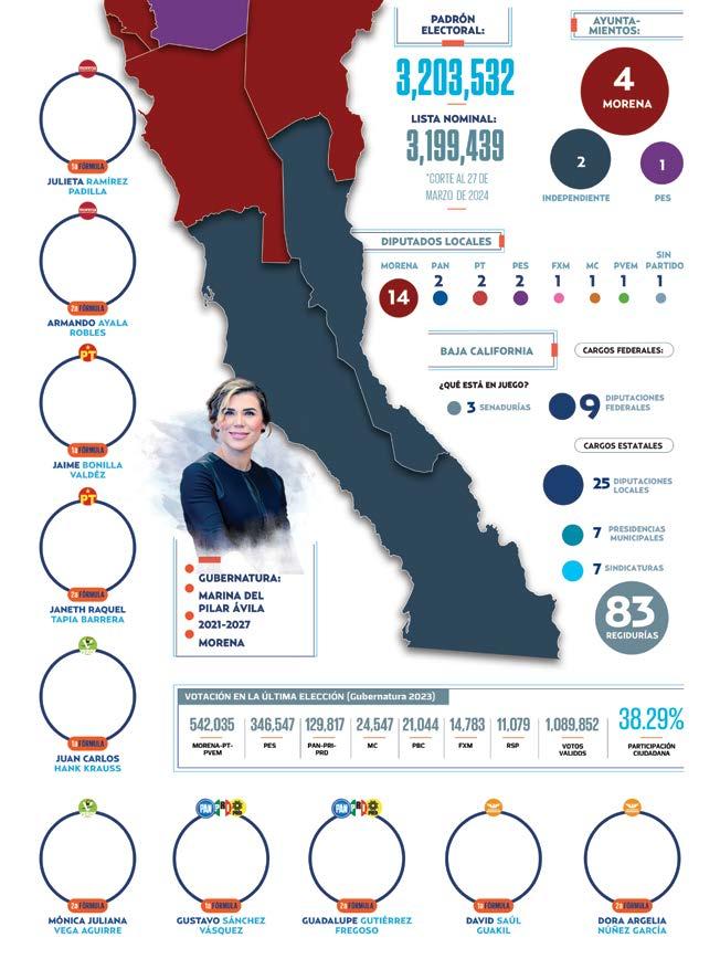 cuatro son gobernadas por Morena, entre ellas Tijuana y Mexicali. Dos localidades tienen un alcalde independiente y un municipio tiene el sello del PES.
