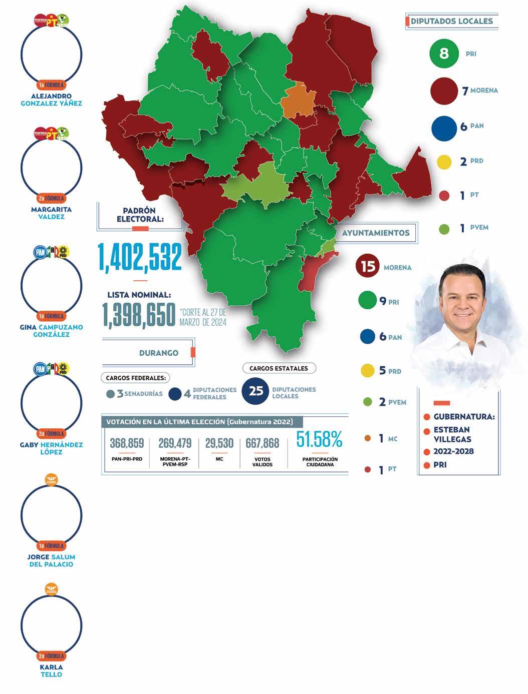 El 2 de junio Durango renovará el Congreso Local y elegirán a representantes al Senado de la República y Cámara de Diputados. A esta entidad la gobierna el PRI, pero las presidencias municipales están en poder de Morena. Durante la jornada electoral se espera la participación de un millón 398 mil 650 de personas que integran la Lista Nominal del Instituto Nacional Electoral.