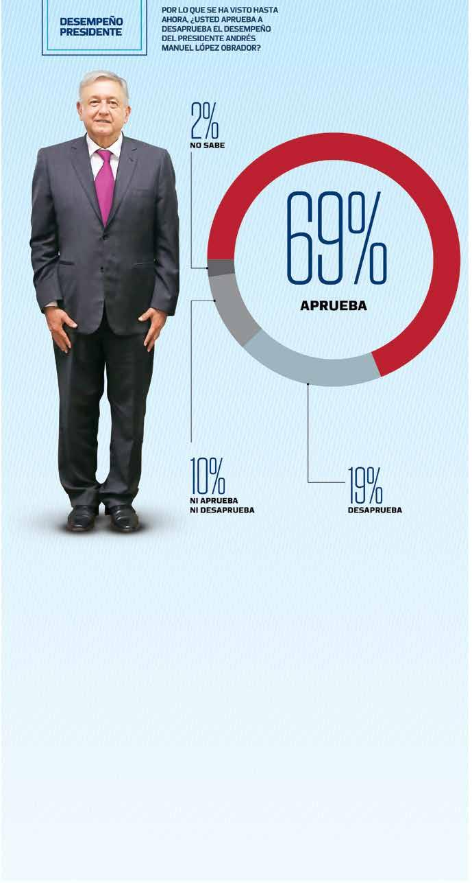 A la pregunta de “por lo visto hasta ahora, ¿usted aprueba o desaprueba el desempeño del presidente Andrés Manuel López Obrador?, 69 por ciento lo aprueba; 19 por ciento lo desaprueba; 10 por ciento ni aprueba