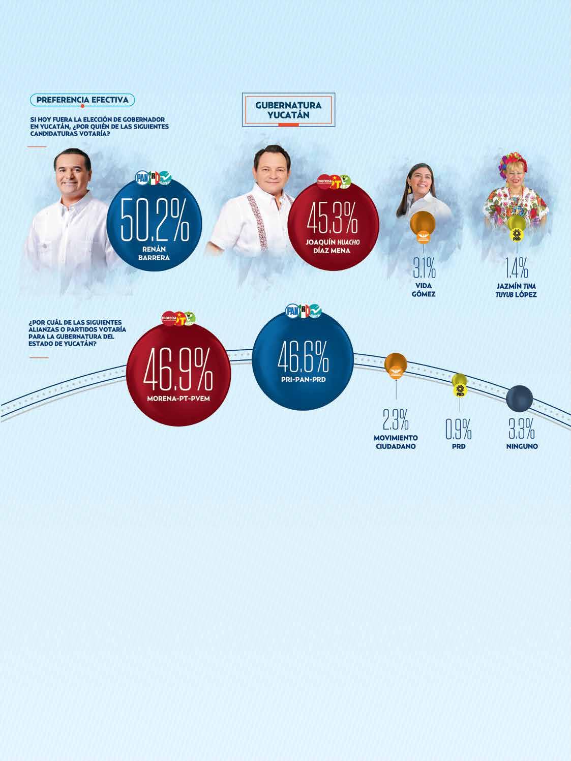 En segundo lugar se ubicó a José Pepe Yunes, del PRI-PANPRD, quien registró 40 por ciento de las preferencias. En tercer sitio quedó Polo Deschamps, aspirante por Movimiento Ciudadano. Por él, 8.9 por ciento votaría.