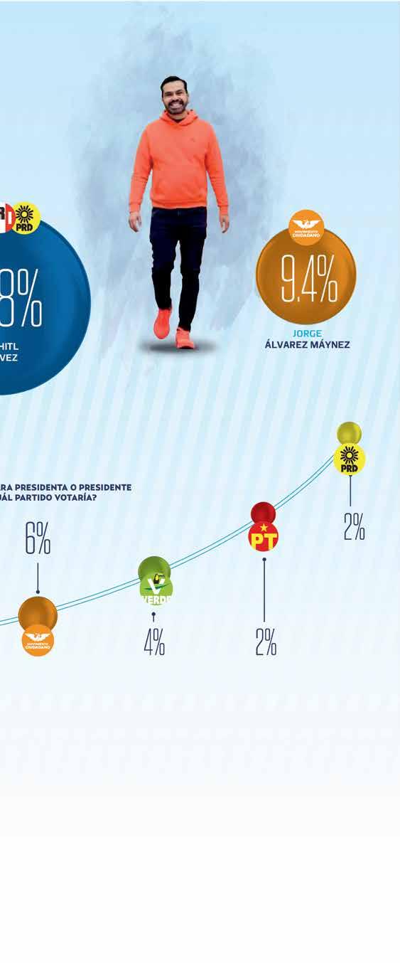 conocer la intención del voto sobre partidos políticos: “¿Por cuál de las siguientes alianzas o partidos votaría para la gubernatura del estado de Jalisco?”. Los resultados de la segunda pregunta reflejan que las preferencias se mantienen a favor de Movimiento Ciudadano recibiría 41.3 por ciento de los votos.