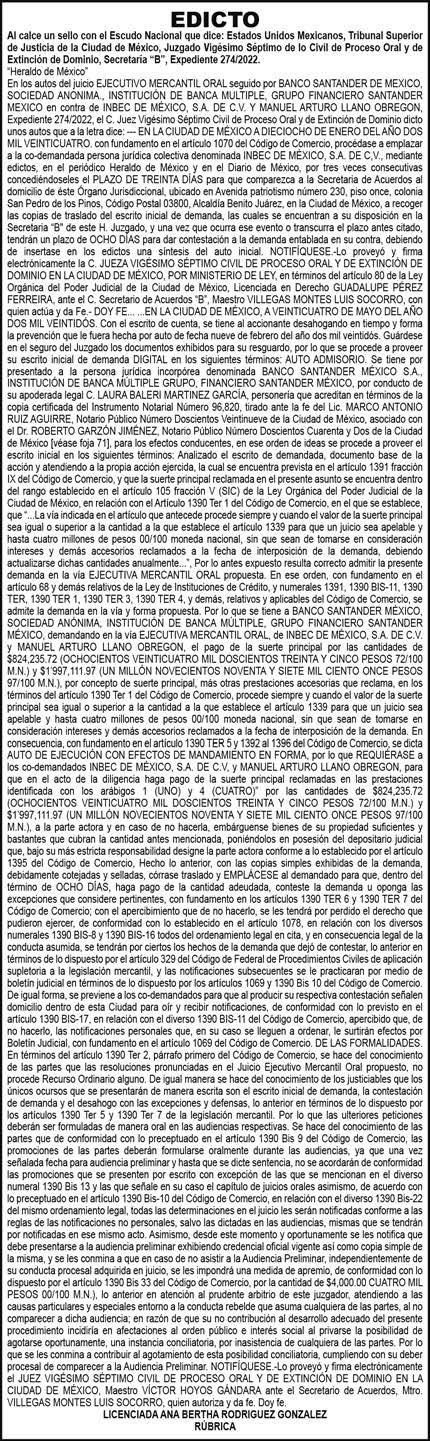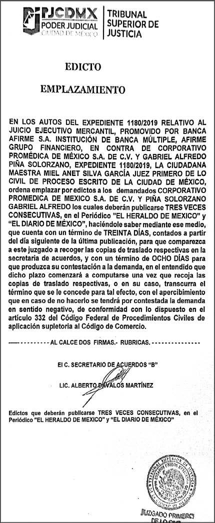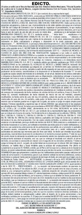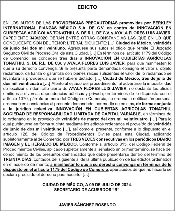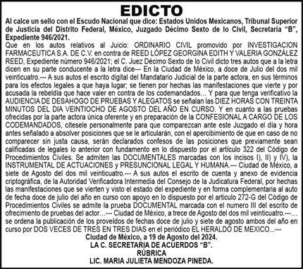 Periódico El Heraldo de México. Editor Responsable: Alfredo González Castro, Número de Certificado de Reserva otorgado por el Instituto Nacional del Derecho de Autor: 04-2009-060419022100-101. Número de Certificado de Licitud de Título y Contenido: 16921. Domicilio de la Publicación: Av. Insurgentes Sur, No. 1271, piso 2, oficina 202, Extremadura Insurgentes, Benito Juárez, C.P. 03740. Impreso en LA CRÓNICA DIARIA, SA DE CV, Avenida Azcapotzalco La Villa 160, Colonia San Marcos, Alcaldía Azcapotzalco, Ciudad de México, CP 02020. Distribuidores: ARREDONDO E HIJOS DISTRIBUIDORA, SA de CV, Iturbide 18 local D, Colonia Centro de la Ciudad de México Área 4, Alcaldía Cuauhtémoc, Ciudad de México, CP 06040. ELIZABETH IVONNE GUTIÉRREZ ORTIZ, Callejón 2o de la Luz 52, Departamento 4, Interior 1, Colonia Anáhuac II Sección, Alcaldía Miguel Hidalgo, Ciudad de México, CP 11320. AEROVÍAS EMPRESA DE CARGO, SA de CV, Paseo de la Reforma 445, Piso 9, Colonia Cuauhtémoc, alcaldía Cuauhtémoc, Ciudad de México, CP 06000 Publicación Diaria No. 2624 Martes 20 de agosto 2024.