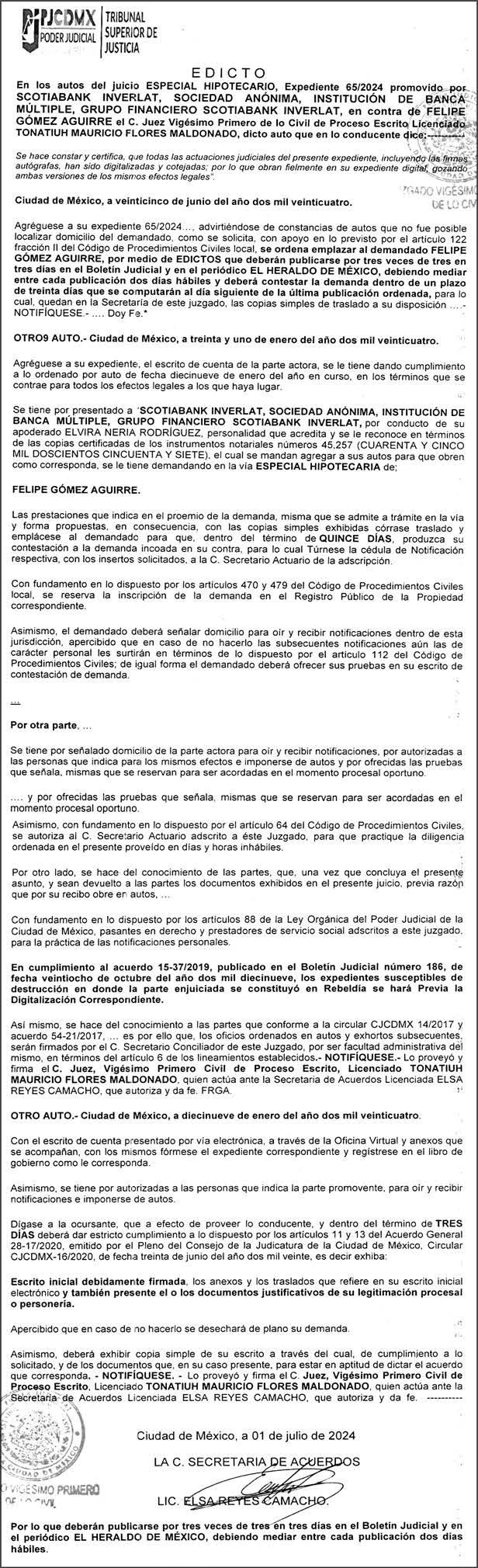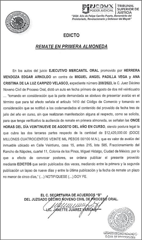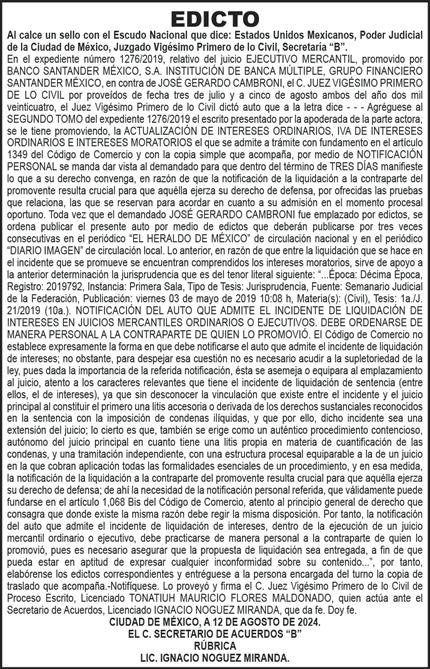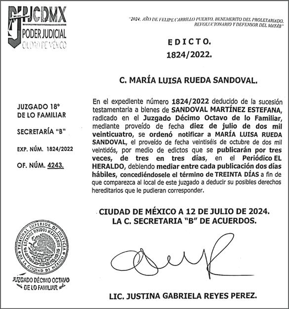 Periódico El Heraldo de México. Editor Responsable: Alfredo González Castro, Número de Certificado de Reserva otorgado por el Instituto Nacional del Derecho de Autor: 04-2009-060419022100-101. Número de Certificado de Licitud de Título y Contenido: 16921. Domicilio de la Publicación: Av. Insurgentes Sur, No. 1271, piso 2, oficina 202, Extremadura Insurgentes, Benito Juárez, C.P. 03740. Impreso en LA CRÓNICA DIARIA, SA DE CV, Avenida Azcapotzalco La Villa 160, Colonia San Marcos, Alcaldía Azcapotzalco, Ciudad de México, CP 02020. Distribuidores: ARREDONDO E HIJOS DISTRIBUIDORA, SA de CV, Iturbide 18 local D, Colonia Centro de la Ciudad de México Área 4, Alcaldía Cuauhtémoc, Ciudad de México, CP 06040. ELIZABETH IVONNE GUTIÉRREZ ORTIZ, Callejón 2o de la Luz 52, Departamento 4, Interior 1, Colonia Anáhuac II Sección, Alcaldía Miguel Hidalgo, Ciudad de México, CP 11320. AEROVÍAS EMPRESA DE CARGO, SA de CV, Paseo de la Reforma 445, Piso 9, Colonia Cuauhtémoc, alcaldía Cuauhtémoc, Ciudad de México, CP 06000 Publicación Diaria No. 2625, Miércoles 21 de Agosto de 2024.