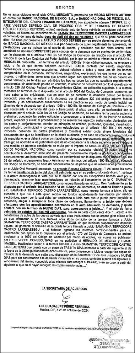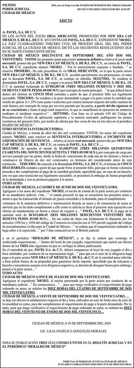 Periódico El Heraldo de México. Editor Responsable: Alfredo González Castro, Número de Certificado de Reserva otorgado por el Instituto Nacional del Derecho de Autor: 04-2009-060419022100-101. Número de Certificado de Licitud de Título y Contenido: 16921. Domicilio de la Publicación: Av. Insurgentes Sur, No. 1271, piso 2, oficina 202, Extremadura Insurgentes, Benito Juárez, C.P. 03740. Impreso en LA CRÓNICA DIARIA, SA DE CV, Avenida Azcapotzalco La Villa 160, Colonia San Marcos, Alcaldía Azcapotzalco, Ciudad de México, CP 02020. Distribuidores: ARREDONDO E HIJOS DISTRIBUIDORA, SA de CV, Iturbide 18 local D, Colonia Centro de la Ciudad de México Área 4, Alcaldía Cuauhtémoc, Ciudad de México, CP 06040. ELIZABETH IVONNE GUTIÉRREZ ORTIZ, Callejón 2o de la Luz 52, Departamento 4, Interior 1, Colonia Anáhuac II Sección, Alcaldía Miguel Hidalgo, Ciudad de México, CP 11320. AEROVÍAS EMPRESA DE CARGO, SA de CV, Paseo de la Reforma 445, Piso 9, Colonia Cuauhtémoc, alcaldía Cuauhtémoc, Ciudad de México,