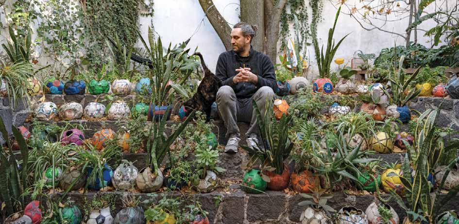El artista mexicano Rodrigo Ímaz (CDMX, 1982) presenta Tiro Libre en el Museo de Arte Moderno, instalación que despliega 100 balones ponchados, que ha ido coleccionando a lo largo de los años, convertidos en macetas.