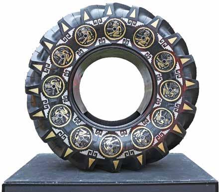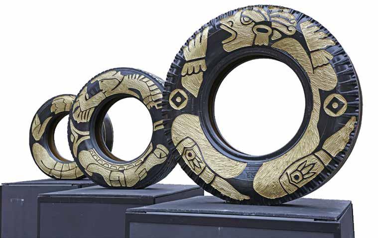 “Me encanta que esta exposición haga referencia a los sellos cilíndricos que giraron en todas las culturas de la humanidad para imprimir recuerdos. Sellos de cilindro que, como mis neumáticos, me permiten no sólo reciclar la basura en algo nuevo, sino también reciclar algo que gira y se convierte en un objeto que ha dejado de estar hecho para la velocidad, en un objeto destinado a perder velocidad, incluso para cuestionarlo, como rodillos que lentamente se mueven para recuperar la memoria de lo atropellado, de lo borrado o denigrado por los tiempos modernos”, afirmó