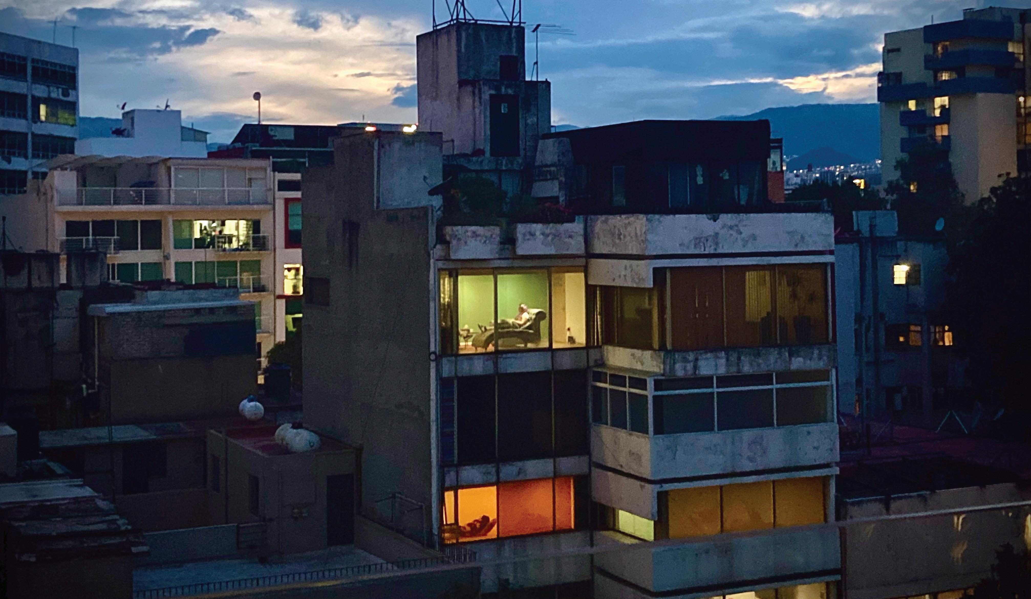 Escena cotidiana en un edificio donde hay consultorios de salud mental, en la colonia Extremadura Insurgentes de la CDMX. La imagen está inspirada en la obra del pintor modernista Edward Hopper, quien retrataba la soledad en la vida estadounidense. Foto: Federico Gama.