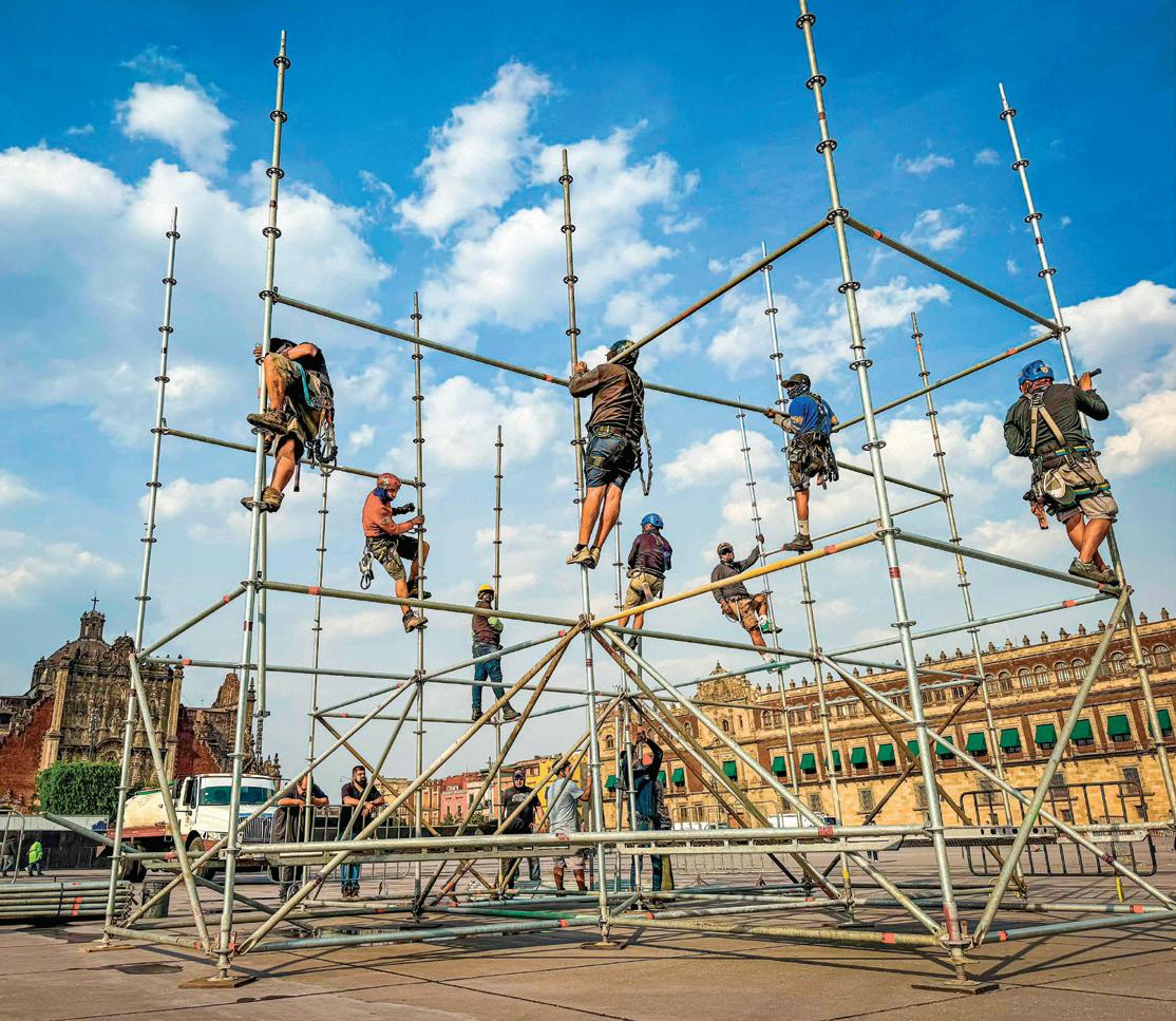 Los trabajadores capitalinos instalan, en tiempo récord, escenarios monumentales en el Zócalo de la CDMX que sirven para las presentaciones de artistas en conciertos masivos. Sin darse cuenta, al atardecer los operarios se convierten en parte del paisaje.