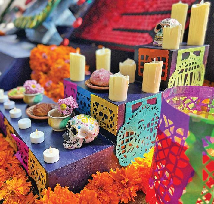 ● Este año, el altar rinde homenaje al artista que concibió el sitio. Incluye flores de cempasúchil, veladoras, papel picado y piezas prehispánicas.