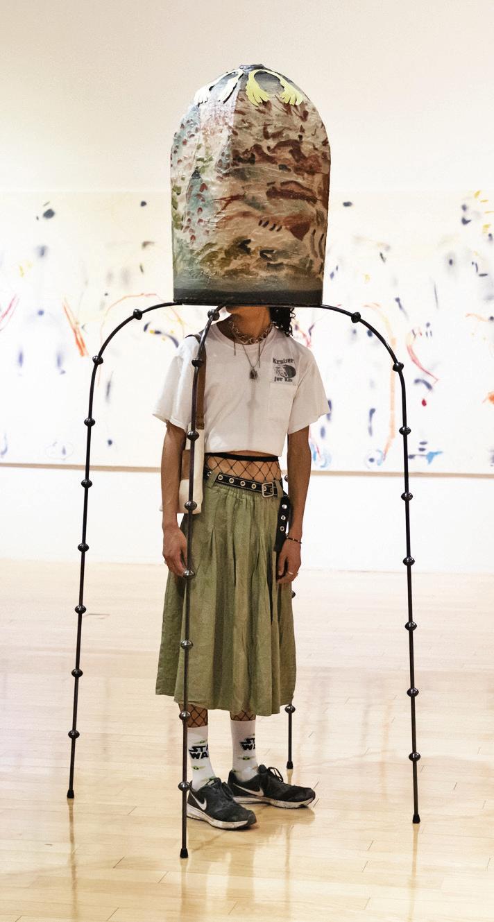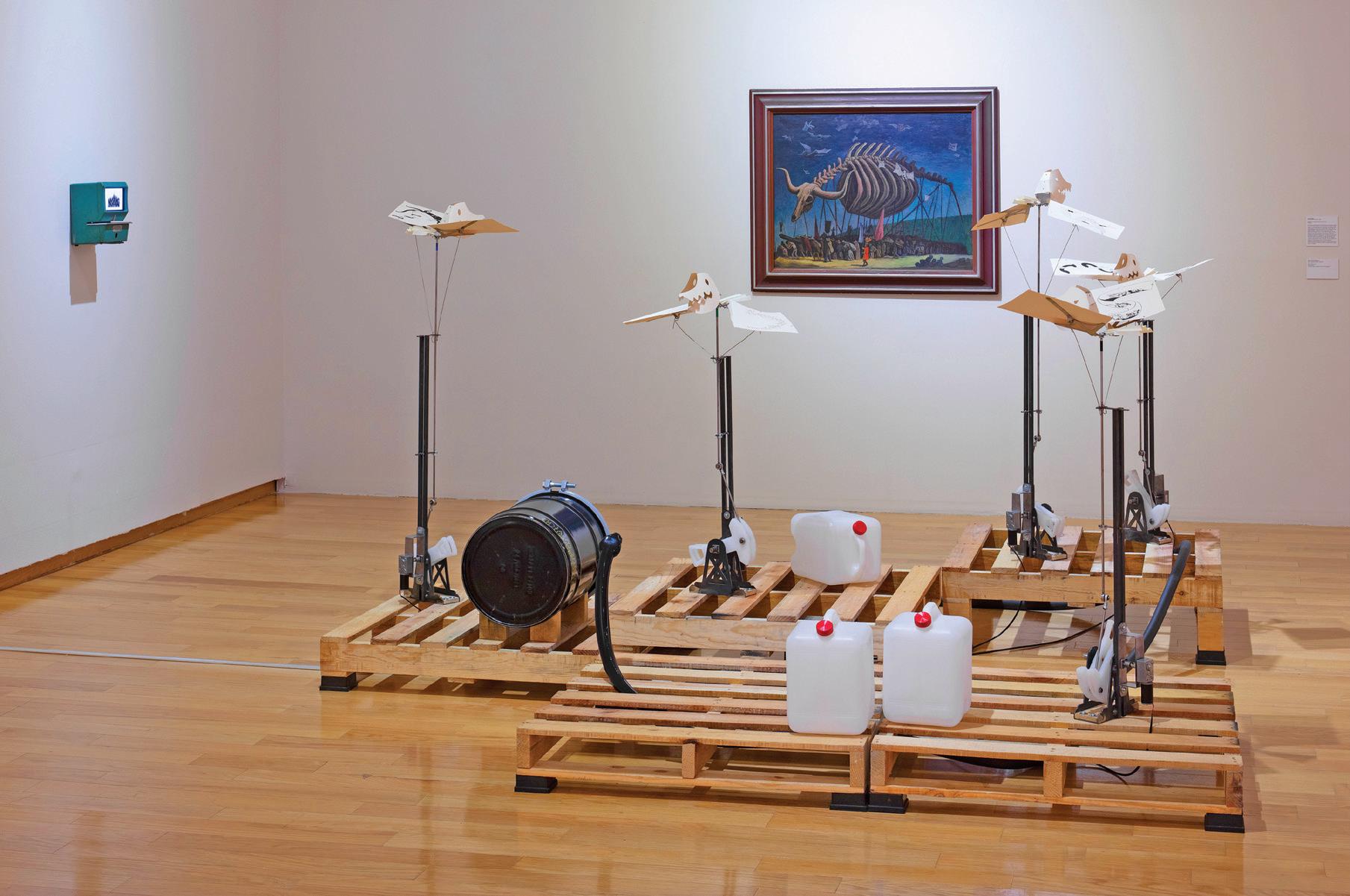 la competitividad occidental. La pieza final de su comisión es un dibujo a muro y políptico en técnica mixta titulado Tiempo de ganar “Investigando localmente encontré a Alejandra Arellano, seleccionada nacional de básquetbol y primera mujer entrenadora de la liga mexicana, empecé a trabajar con ella en crear un posible programa de entrenamiento; era muy importante que fuera eso y no un seminario o taller porque digamos que las prácticas artísticas colectivas, así como la economía del arte, no se enseña en las escuelas de arte”, dice INSPIRACIÓN HISTÓRICA También para Josué Mejía (CDMX, 1994), la influencia de Guanajuato fue fundamental al proponer una pieza para la Bienal FEMSA. Su instalación Presagios en vuelo sobre pisos de madera reflexiona sobre la industrialización en un escenario como el Bajío mexicano. “Trabajar en el contexto de Guanajuato fue muy enriquecedor, justamente mi pieza y el proyecto surgen a partir de mi encuentro con la pintura México negro, del guanajuatense José Chávez Morado. A partir de esta obra y las ideas que había estado trabajando antes en relación con la industria y también con el parque Puerto Interior me permití especular en torno a la noción de ideas como industrialización y modernidad, de cómo el arte justamente las retrata y también como el arte se nutre de todas esas industrias”.