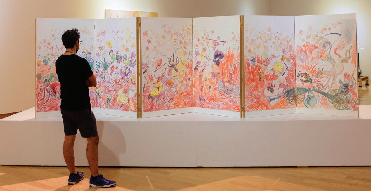 PÚBLICO. Un visitante frente a Biombo de la batalla, 2024, de Javier Barrios. 15 Bienal FEMSA “La voz de la montaña”. Imagen: cortesía de Bienal FEMSA.