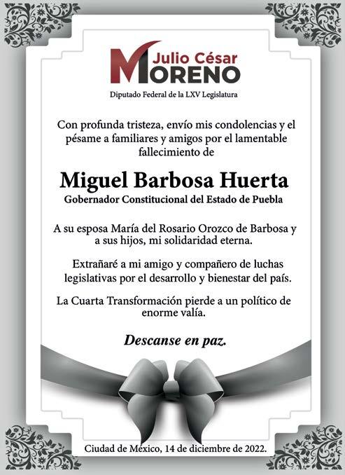 Como colofón, Mier no asistió ayer a los funerales de Barbosa. Igual hizo el senador Alejandro Armenta, también suspirante a la candidatura poblana y a quien Barbosa le ganó la candidatura en 2019, tras el trágico accidente que acabó con la vida de la gobernadora Martha Erika Alonso y su esposo Rafael Moreno Valle En resumen, la carrera sucesoria en Puebla se regresa al kilómetro cero para estos tres aspirantes, que por lo pronto esperan quién será el gobernador sustituto, que podría ser, se dice, Rosario Orozco, esposa de Barbosa o Céspedes, quien quedaría con un pie fuera de 2024.