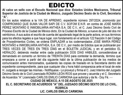 HIJOS DISTRIBUIDORA, SA de CV, Iturbide 18 local D, Colonia Centro de la Ciudad de México Área 4, Alcaldía Cuauhtémoc, Ciudad de México, CP 06040. ELIZABETH IVONNE GUTIÉRREZ ORTIZ, Callejón 2o de la Luz 52, Departamento 4, Interior 1, Colonia Anáhuac II Sección, Alcaldía Miguel Hidalgo, Ciudad de México, CP 11320. AEROVÍAS EMPRESA DE CARGO, SA de CV, Paseo de la Reforma 445, Piso 9, Colonia Cuauhtémoc, alcaldía Cuauhtémoc, Ciudad de México, CP 06000 Publicación Diaria No. 214, lunes 1 de septiembre de 2025.