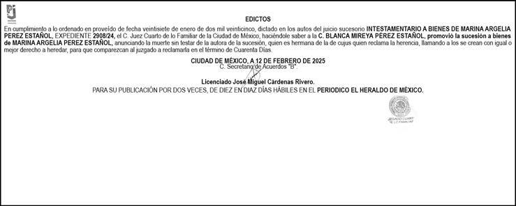 DIRECTOR GENERAL Periódico El Heraldo de México. Editor Responsable: Alfredo González Castro, Número de Certificado de Reserva otorgado por el Instituto Nacional del Derecho de Autor: 04-2009-060419022100-101. Número de Certificado de Licitud de Título y Contenido: 16921. Domicilio de la Publicación: Av. Insurgentes Sur, No. 1271, piso 2, oficina 202, Extremadura Insurgentes, Benito Juárez, C.P. 03740. Impreso en LA CRÓNICA DIARIA, SA DE CV, Avenida Azcapotzalco La Villa 160, Colonia San Marcos, Alcaldía Azcapotzalco, Ciudad de México, CP 02020. Distribuidores: ARREDONDO E HIJOS DISTRIBUIDORA, SA de CV, Iturbide 18 local D, Colonia Centro de la Ciudad de México Área 4, Alcaldía Cuauhtémoc, Ciudad de México, CP 06040. ELIZABETH IVONNE GUTIÉRREZ ORTIZ, Callejón 2o de la Luz 52, Departamento 4, Interior 1, Colonia Anáhuac II Sección, Alcaldía Miguel Hidalgo, Ciudad de México, CP 11320. AEROVÍAS EMPRESA DE CARGO, SA de CV, Paseo de la Reforma 445, Piso 9, Colonia Cuauhtémoc, alcaldía Cuauhtémoc, Ciudad de México, CP 06000 Publicación Diaria No. 2806, lunes 10 de Marzo de 2025.